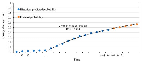 The probability of casing damage for any well at a given time can be obtained using the optimal model determined in the above step. It is considered that a probability greater than 0.5 suggests that the casing of the well may have been damaged. Otherwise, the casing of the well is considered to be in a normal condition. A higher probability means that it is more likely that the casing has been damaged. Additionally, the optimal model can be used to predict the risk of future casing failure and the exact time of possible casing damage for any one well. The process is as follows. The built model is first used to predict the probability of damage at each time point from t1, t2, to tn. A suitable regression model is then used to fit these prediction points. Finally, regression curves are used to predict future risk, see Figure 3.