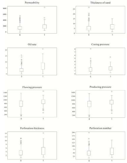 First, box plots were used to qualitatively analyze all influencing factors, as shown in Figure 7, where label 0 represents normal wells and label 1 represents casing-damaged wells.