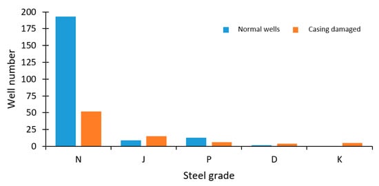 A bar chart was drawn to analyze the influencing factors of casing damage. Taking the steel grade at the level of well granularity as an example (Figure 8), the casing with steel grades N and P tends to suffer less casing damage.