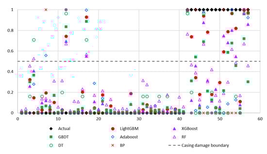 Following parameter optimization and model verification, the failure probability was output by each model with the best parameter set. The prediction results for well granularity are shown in Figure 10.