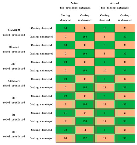 As noted above, the probability prediction results are a binary classification. If the value is greater than 0.5, the output is 1, indicating possible casing damage, and if the value is less than or equal to 0.5, the output is 0, indicating no failure. Figure 11 quantitatively depicts the classification output of the different models as a confusion matrix. Figure 10 and Figure 11 show that the results of the different algorithms vary appreciably, but there is a common trend that the accuracy of identifying undamaged wells is higher than the accuracy of identifying damaged wells. It is assumed that this result is mainly due to the relatively small number of sample data for wells having casing failure.