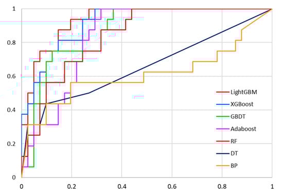 Table 8 and Figure 12 present the accuracy of the seven algorithms for the case in this paper. Taking accuracy as the main evaluation index and comprehensively considering the balance of precision and recall (F1 value), a comparison of the results of the different models shows that LightGBM performs best, followed by XGBoost and the RF algorithm. This result is consistent with our perception of these common algorithms. The first two boosting algorithms are both advanced versions of the GBDT. LightGBM supports distribution calculation and can quickly process massive data, and it has a much less restrictive maximum depth, ensuring high efficiency while preventing over-fitting. Although XGBoost has a strong generalization ability, it automatically learns the split direction of missing values and customizes the loss function, and its prediction is thus more accurate. The RF algorithm is a bagging algorithm that avoids the overfitting problem of single decision trees and handles input samples with high-dimensional features. It evaluates the importance of individual features on the classification problem and the interaction between different features and it obtains good results for default value problems. Additionally, although the backpropagation neural network has a strong information synthesis ability and can fit various complex models, because of its black-box nature, it usually requires a larger amount of data. It is thus difficult to achieve good verification results for the backpropagation neural network in this case because of insufficient data.
