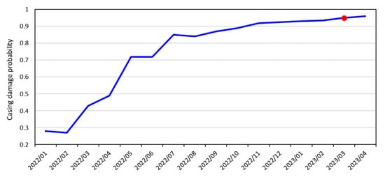 Applying the model at regular time intervals to predict the risk of casing damage, such as in the example of well W1406 (Figure 14), it was found that the curve of the casing damage probability had an obvious upward trend. The prediction curve for well W1406 indicates that damage to the casing may have already occurred in April 2022 (with the probability reaching 0.5), and the casing damage risk will be extreme in March 2023 (the red dot, with the probability approaching 1).