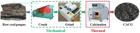 As can be seen from Table 1, the main chemical components of coal gangue are silica (SiO2) and alumina (Al2O3), accounting for 96.10% of the total, which is highly similar to fly ash. However, the activity of coal gangue is low because of its overly stable crystal structure, high organic carbon, and fewer hydraulic materials [15]. Therefore, a composite activation strategy from the literature was employed to enhance the reactivity of coal gangue [20]. The results showed that the pozzolanic activity of coal gangue was at its highest when the temperature was 700 °C and the calcination time was 2 h. The procedures of the composite activation for coal gangue are shown in Figure 2. Firstly, the raw samples were crushed by a jaw crusher until the maximum particle sizes were smaller than 4.75 mm. Then, the coarse crushed particles were placed into a ball mill for grinding until milled powder passed through a 0.075 mm sieve, at which time the residue was less than 8%. Finally, the coal gangue powder was calcined at 700 °C in a muffle furnace for 2 h.