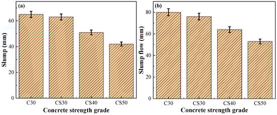 As can be seen from Figure 7, the slump and slump flow of the AACGC were smaller than those of the OPCC. The main reason was that the water imbibition of pozzolan cementitious materials (coal gangue and slag) was higher than that of ordinary Portland cement [21]. The CACG and slag absorbed a part of the water during the mixing process, which led to a decrease in the liquidity of the AACGC. In addition, the early hydration reaction of alkali-activated cementitious materials is faster and generates more geopolymers, resulting in a more viscous gel [31]. With the concrete strength grades of the AACGC having increased from C30 to C50, the slump and slump flow of the AACGC decreased by 33.33% and 30.26%, respectively. This was because the water-to-binder ratio gradually decreased with the increase in concrete strength grade, which led to a decrease in the liquidity of the AACGC.