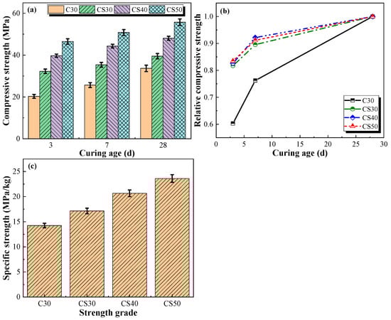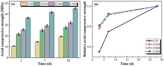 Figure 14a displayed that the axial compressive strength of the AACGC was higher than that of the OPCC. The 3 d, 7 d, and 28 d axial compressive strengths of the CS30 group were 2.01 times, 1.76 times, and 1.47 times those of the C30 group. This was because the intensive hydration products of alkali-activated coal gangue cementitious materials infiltrated and filled the surface pores of sand and gravel, which strengthened the interfacial transition zone (ITZ) between the aggregates and paste matrix, thereby alleviating the propagation of cracks during the loading procedure and enhancing the mechanical interaction between the paste and the aggregates [25]. Moreover, the axial compressive strength of the AACGC gradually increased as the concrete strength grade increased. When the concrete strength grades increased from CS30 to CS50, the axial compressive strength of the AACGC increased by 64.42%. The growth mechanism was similar to alkali-activated cementitious materials [21,41]. Figure 14b indicated that compared with the OPC concrete, the axial compressive strength of the AACGC developed rapidly in the first 7 d and then improved tardily after 7 d as the curing time continued. The 3 d axial compressive strength of the AACGC was 78.11~81.00% of the 28 d axial compressive strength, while the 3 d axial compressive strength of the OPCC was 55.00% of the 28 d axial compressive strength. Meanwhile, the 7 d axial compressive strength of the AACGC was 91.28~92.56% of the 28 d axial compressive strength, while the 7 d axial compressive strength of the OPCC was 75.01% of the 28 d axial compressive strength.