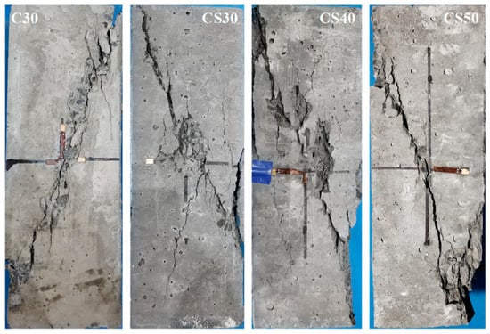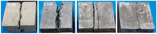 Figure 10 displays that the failure mode of the AACGC is consistent with that of OPCC. As the load value increased, cracks appeared first in the middle of the specimens, then expanded to the top and bottom to penetrate. In addition, the fracture surface was mainly the intersection of coarse aggregate and mortar. This was because the intersection of coarse aggregate and mortar was the weak zone inside the specimen.
