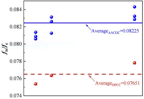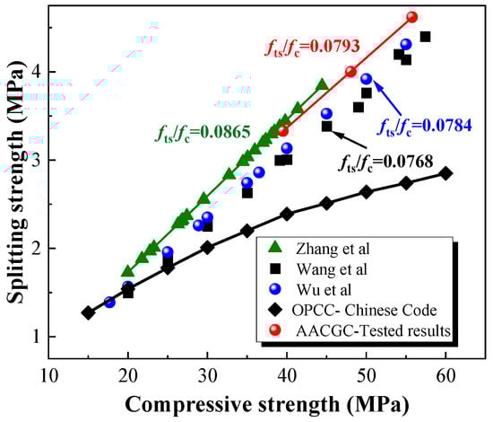 The ratio of the splitting tensile strength to the compressive strength (fts/fc) for OPCC and AACGC is summarized in Figure 11. It can be seen that the average fts/fc of the AACGC is 7.49% higher than the average fts/fc of the OPCC, which indicates that the fts of the AACGC is superior to the fts of the OPCC. In order to further analyze the relationship between the fts and the fc of AACGC, the previous experimental data reported in the existing literature [34,35,36,37] were applied, as plotted in Figure 12. The fts and the fc of alkali-activated cementitious material concrete and the OPCC exhibit an excellent linear relationship. In addition, the AACGC exhibited a higher fts under the same fc than that of the OPCC, which can be attributed to the improvement of the interface between the aggregates and the pastes. The denser hydration products of alkali-activated cementitious materials penetrated the pores of aggregates, which increased the mechanical interlocking at the aggregate–paste interface and improved the interfacial microstructures, thereby effectively enhancing the splitting tensile strength of the AACGC [34].