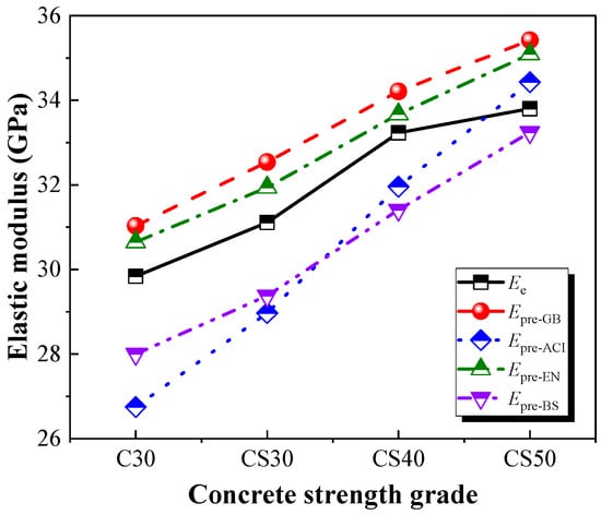 The empirical formulas of the elastic modulus and compressive strength for the OPCC in various regions codes were summarized in Table 4. These were employed to obtain the predicted value (Epre) of the elastic modulus of the AACGC and OPCC, in which Ec is the elastic modulus of specimens (GPa), and fcu,k is the 28 d compressive strength of OPCC and AACGC (MPa). In addition, the experimental values (Ee) of the elastic modulus of specimens were calculated using Equations (1) and (2), as shown in Figure 13.
