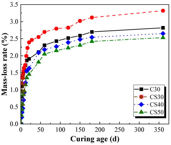 Figure 16 indicates that the mass-loss rate of the AACGC and OPCC increases gradually with the increase in curing ages. It should be noticed that the mass-loss rate increased rapidly in the first 30 days, and then developed slowly. In the early stage of curing, the internal hydration reaction of specimens is fast, and the hydration heat is high, which leads to the rapid evaporation of free water and loss of mass. Moreover, the mass-loss rate of the AACGC exhibited a negative correlation with the concrete strength grade. The mass-loss rate of the CS30 group was 1.21 times and 1.30 times that of the CS40 and CS50 groups, respectively. As the concrete grade increases, the water-to-binder ratio and the free water content of the AACGC decreases gradually, leading to the reduction in the mass-loss rate. Compared with the OPCC, the mass-loss rate of the AACGC was higher. The mass-loss rate of the AACGC at 28 days, 60 days, 120 days, and 360 days was 1.29 times, 1.17 times, 1.14 times, and 1.15 times that of the OPCC. The main reason is that there is a large amount of free water in the alkali-activated cementitious material system.