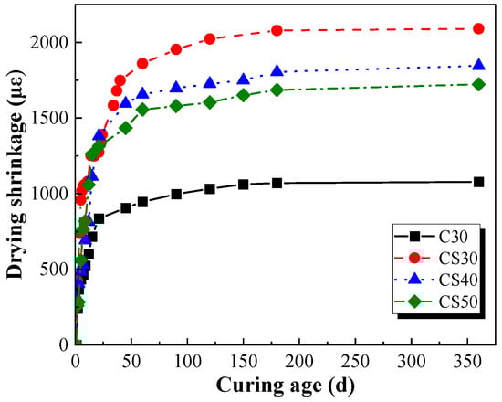 As displayed in Figure 17, the drying shrinkage of each group gradually increased with the increase in curing age. It was worth noting that the trend of drying shrinkage and mass-loss rate with curing age was similar; it increased rapidly in the first 30 days and then developed slowly. This phenomenon can be attributed to the more rapid polymerization reaction that promotes the formation of gel and capillary pores, herein leading to higher porosity in the paste. Additionally, the stronger self-densification effects and connected capillary pores lead to higher capillary pressure due to migration procedures. Therefore, the dimensional stability of AACGC was inferior to the conventional normal-strength concrete, namely a higher drying shrinkage [24,42]. In addition, the drying shrinkage of the AACGC decreased gradually with the increase in concrete strength grade. After 360 days of curing, the drying shrinkage of the CS30 group was 1.16 times and 1.24 times that of the CS40 and CS50 groups, respectively. As concrete strength grade increases, the water-to-binder ratio and internal free water content of the AACGC gradually decrease, so the dry shrinkage deformation caused by evaporation of free water gradually decreases. Compared with the OPCC, the drying shrinkage of the AACGC increased by 97.87% after 360 days. This high-magnitude shrinkage of AACGC over OPCC can be attributed to the differences in the pore structure and hydration products of the pastes. The high drying shrinkage and a large number of micro-cracks caused by drying shrinkage were important factors limiting the wide application of the AACGC. Thereby, several methods for reducing drying shrinkage were recommended to be applied in the preparation of the AACGC, such as shrinkage-reducing admixture, fibers, expansive admixture, and water-retaining admixture.