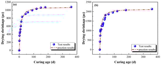 Extensive investigation demonstrates that the drying shrinkage of alkali-activated cementitious materials is greater than that of conventional Portland-based materials [22,41]. To date, global scholars have proposed various half-empirical prediction models to describe the drying shrinkage of the OPCC under different conditions [43,44,45,46]. Nevertheless, there is no applicable model that can accurately reflect the drying shrinkage behaviors of the AACGC. Referring to the drying shrinkage prediction models proposed by Li et al. [47], a hyperbolic prediction model was employed in the presented study, as shown in Equation (5).