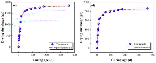 Comparisons of the prediction results and test results of drying shrinkage: (a) C30; (b) CS30; (c) CS40; (d) CS50.