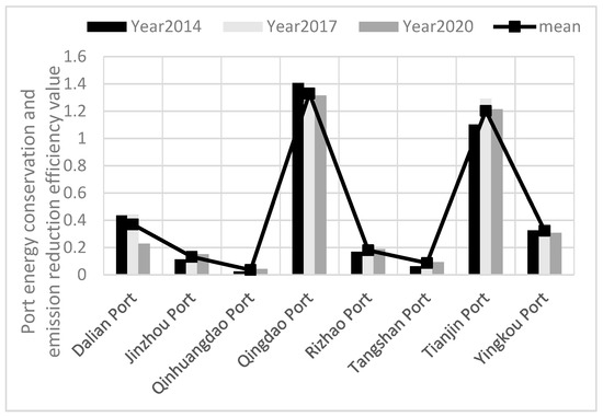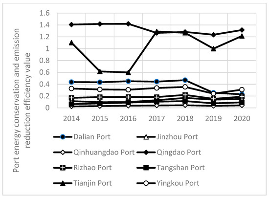 The energy conservation and emission reduction efficiency of ports in China’s Bohai Rim region is characterized by two groups of agglomeration. Figure 3 shows that the energy conservation and emission reduction efficiency of Qingdao Port and Tianjin Port remained high and presented an upward trend from the year of 2014 to 2020, Qingdao Port ranked first with the highest efficiency of 1.42 and the lowest value of 1.266, with a relatively small amplitude of fluctuation, while Tianjin Port ranked second with the highest value of 1.291 and the lowest value of 0.599, but its amplitude of fluctuation was relatively large. The efficiency values of the remaining ports did not exceed the overall average of 0.435, and the amplitude of fluctuation was not large. The main reason is that the scale of Qingdao Port and Tianjin Port is relatively large, the management of ports is more scientific and the investment structure of port energy conservation and emission reduction is more reasonable. Since 2010, Qingdao Port has begun to establish a low-carbon economy production and technology system with independent innovation as its connotation; it invested 4.5 billion yuan in 2015 to eliminate an amount of high energy consumption and high pollution equipment, arming the port with advanced technology and equipment, so the efficiency is at a high level and is relatively stable. Tianjin Port has the largest fluctuation during the time series, which is mainly due to the implementation of the LNG (Liquefied Natural Gas) clean energy project in Tianjin Port since 2013. It has experienced the development stage of the LNG project with a construction period of 3–4 years, and the project was put into use by 2017. Therefore, it has produced a rapid increase in 2017 after the decline in energy conservation and emission reduction from 2015 to 2016. The energy conservation and emission reduction efficiency of other ports except Tianjin and Qingdao ports is at a low level and the trend of efficiency change is similar, and the fluctuation range is small.