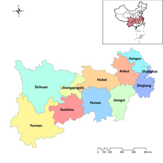 China’s Yangtze River economic zone includes Shanghai, Jiangsu, Zhejiang, Anhui, Jiangxi, Hubei, Hunan, Chongqing, Sichuan, Yunnan, and Guizhou (Figure 1). This zone has an area of approximately 2,052,300 km2, thus accounting for 21.4% of the entire area of China and more than 40% of China’s population and gross domestic product (https://cjjjd.ndrc.gov.cn/zoujinchangjiang/zhanlue/, accessed on 10 May 2022).