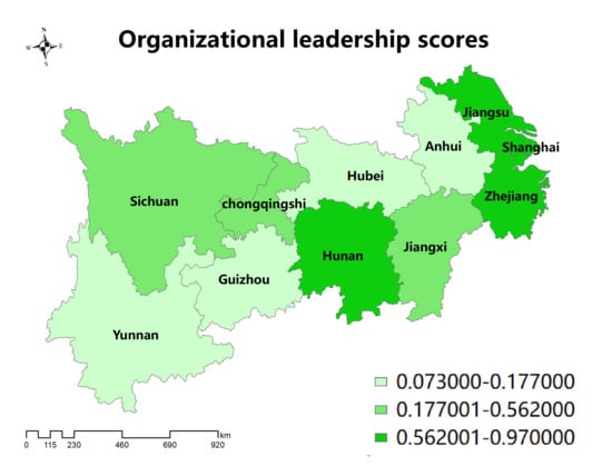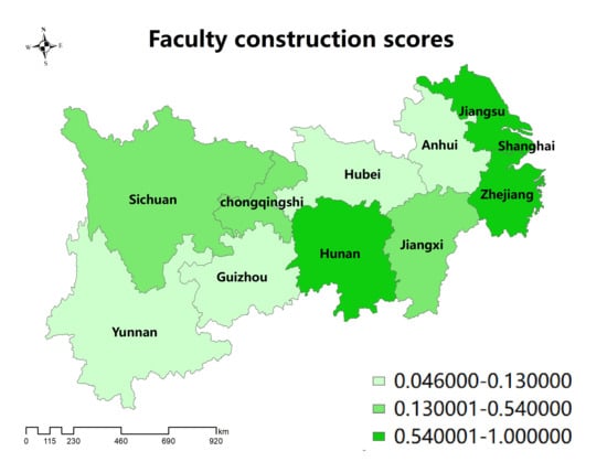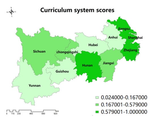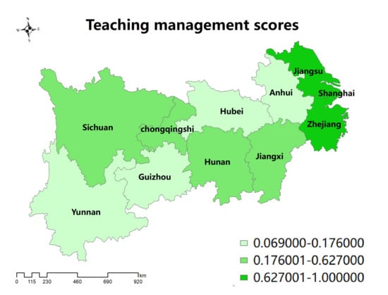 The results of Table 2 are introduced into ArcGIS (wherein ArcMap is an application capable of data processing, editing, analysis, and many other functions and can be used for spatial analysis, building spatial databases, drawing maps, etc.), and the data are classified into three levels according to the natural intermittent classification. The scores of curriculum system, organizational leadership, faculty construction, teaching management, and institutional guarantee are shown in Figure 2, Figure 3, Figure 4, Figure 5 and Figure 6.