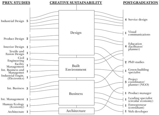 Several alumni now work in fields in which they employ their sustainability expertise rather than the expertise gained from their studies before the interdisciplinary programme (Figure 1). Thus, some alumni work in positions not typical of their disciplinary orientation, such as working for a non-governmental organisation as a project coordinator, even though they have a bachelor’s degree in business. Another example is working in sustainability education, though the bachelor’s degree is in industrial design. However, some alumni seemed to have had a clearer path that was more typically aligned with their studies, for example, a green-building specialist with undergraduate studies in industrial engineering. However, in either case, the goal to further sustainability as a practice was the guiding element, both in their studies with the programme and their following career choices. As Interviewee #11 explained: “You have your values and it’s up to you to find the ways to exercise them. Values are the background and what others see is the ways to exercise them, what are you selling and what should you show out.” The interdisciplinary, sustainability-focused identity has proven to be somewhat incompatible, or poorly understood, in different work contexts. Values appear to be the underlying dimension that is most likely to appear incompatible or cause confusion for employers. The interviewees predominantly defined their profession by the meaning it aims to convey (i.e., the intent to drive sustainability). In their organisations, positions, or projects, this also led to a level of frustration among the alumni. In their respective organisations, a deeper implementation of sustainability was sometimes perceived as an unnecessary and overly complex or even useless approach. It was also suggested that a sustainability approach was seen as too novel or potentially radical, for example, Interviewee #2 said, “There is no benchmark or analogue with which you can show the [needed] work, no budget or time estimation on what is needed for the change”. In general, there was a recognition among the alumni, that as the field of sustainability is emerging and constantly evolving, professionals accept that they are pioneers of something novel and potentially transformative, both in the issues addressed by sustainability, but also in generating a more fundamental change in their working contexts. There was a general belief that they are the best candidates, given their positions and context, to drive sustainability. However, as noted by several interviewees, those positions or specific organisations and fields that focus directly on sustainability are rare or seemingly non-existent.