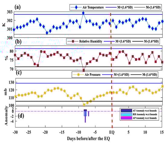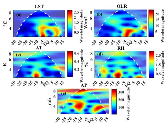 - The anomalous behavior of all the atmospheric parameters is confirmed in wavelet transformations by the local maxima approximation from the time series data within 5–10 days before the EQ.