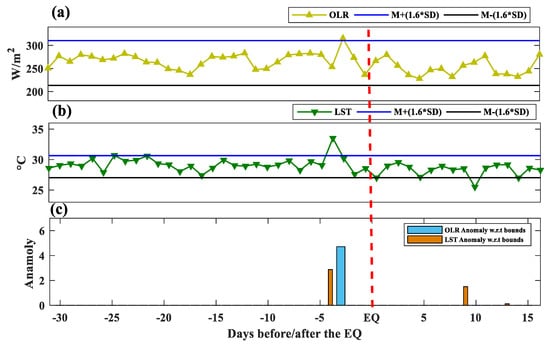 - The LST, AT, RH, AP, and OLR show an unusual variation beyond the defined bounds in the statistical analysis during the 10-day window prior to the seismic event.