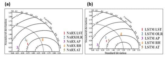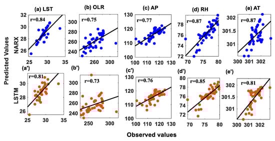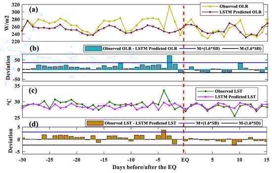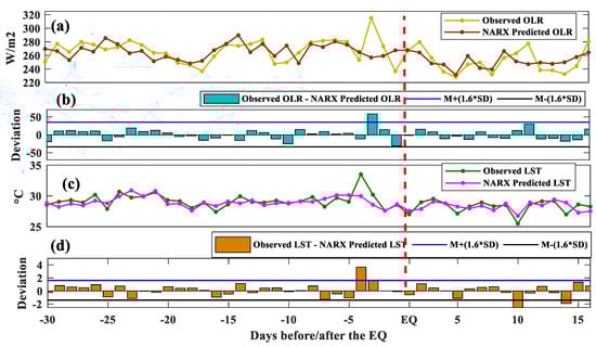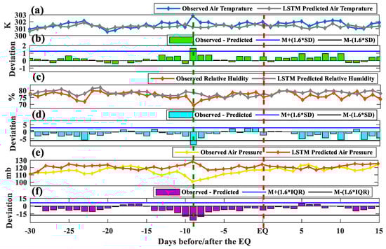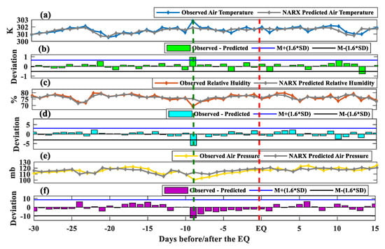 - While using NARX and LSTM algorithms, the maximum of AT, RH, and AP deviation between the observed and predicted values was 5–10 days before the main shock. Nevertheless, for LST and OLR, anomalies occurred within the 5 days before the EQ main shock.