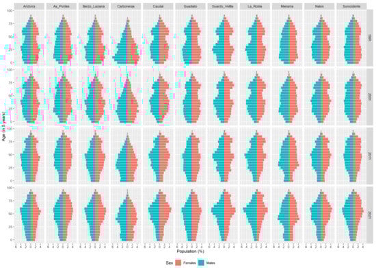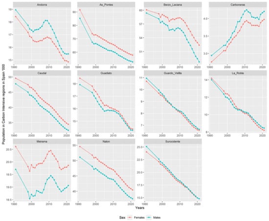 Historically, carbon-intensive activities have been mainly dominated by men [38], so the decarbonization process has a significantly greater impact on job losses for men than for women. The out-migration triggered by the closure of carbon-intensive industries has influenced the gender ratio in these regions. The sex ratio (men to women) of the population in the CIRs has also changed slightly over the last three decades. In 1991, the sex ratio in the CIRs was 0.97 males per female, which will decline to 0.95 males per female by 2021. It is below the national sex ratio of 0.97 males per female in 2021. In the last three decades, the sex ratio in the CIRs of Andorra, Carboneras, Guardo Velilla, and Suroccidente was in favor of men, while in As Pontes, Bierzo Laciana, Caudal, Guadiato, Meirama, and Nalón it was in favor of women. In La Robla, the sex ratio was in favor of women until 2008 and then shifted in favor of men.