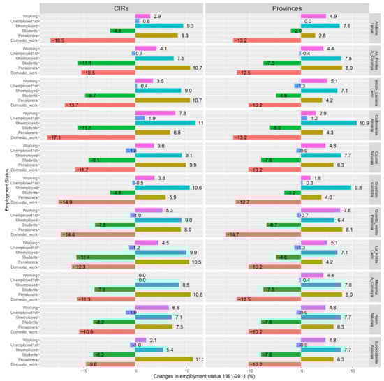 Decarbonization policies have a significant impact on the employment structure of the population in CIRs (Figure 11). Between 1991 and 2011, the share of domestic workers and students in the population declined significantly in all CIRs. The largest decrease in the category of domestic workers was recorded in the Carboneras CIRs (17.1%), followed by Andorra (16.5%) and Guadiato (14.9%). On the other hand, the largest decrease in the student category was recorded in La Robla CIR (11.4%), followed by As Pontes (11.1%) and Carboneras (11.1%). On the contrary, the proportion of pensioners and unemployed has increased in all CIRs. The largest increase in the proportion of pensioners was recorded in CIR of Suroccidente (11.3%), followed by Meirama (10.8%), As Pontes (10.7%) and Bierzo-Laicana (10.7%). The percentage of people looking for their first job has decreased in all CIRs, except Carboneras, Andorra and Bierzo-Laciana. If we compare the employment structure in the CIRs with that of the provincial level, we find that the proportion of the employed population in all CIRs is higher than at the provincial level. Similarly, the proportion of people looking for their first job at the provincial level is much higher than in the CIRs, indicating the outflow of young people from these regions.