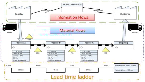 Value stream mapping (VSM) is “a lean management method that uses visualization, analysis and improvement of all the steps in a product delivery process” [28,67,68]. For Western companies, the value flow of the company’s production system reflects a lean concept, but it is an application of the flow map of material and information (FMMI) diagram that is applied to TPS [68]. By using VSM, Rother and Shook (1998) discovered a bottleneck that was causing waste in the “current state map” of the supply chain (purchase, manufacturing, and sales) [68].