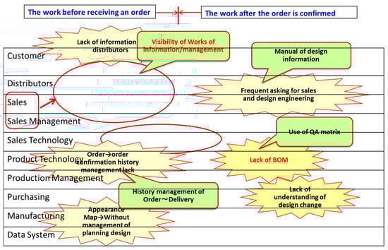 Figure 3 shows the business process from inquiry information to order confirmation and design. The left side is the work before receiving an order, and the problems are as follows and are represented by jagged marks. The orders may be received from distributors, but information on design specifications is difficult to obtain. When an inquiry is received, the history of the order confirmation is not managed, which causes a problem in design. Since it is a food inspection, samples are always taken and the design is started based on the data of the sample test, the data management of the sample test is very important, but the sample data are not utilized.