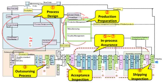 In Figure 2, the square (box) indicates the productive resources (e.g., the stock of tools and equipment, human operators, and information embodied). For example, there are raw materials/parts (things), production instructions (information), and design BOM (information). Arrows indicate activities (flows), and it is assumed that there is a routine supporting this activity in the background. Both the flow of “materials-as media” and the flow of “value-carrying design information” are targets. For example, in the case of a company that purchases parts from overseas suppliers, as an activity such as “delivery of parts from suppliers”, “transport from overseas factories by ship once a week”, and after delivery inspection, it is expected that a reply such as “stored in stock location” will be obtained. Comparison uniformity is not easy for companies to answer because each has its own process, method of dispensing, name of a process, and individual technology and function. The flow map of material and information (FMMI) diagram is shown as a common reference map, and the “place number” indicates where activities are performed, for example, “M1” for “production instruction to each process”, and “M2” for “arrangement of manufacturing BOM to each process” from the development and production technology department to the manufacturing department, etc.). This map enables reasonably meaningful comparisons of the flow patterns, the flow-controlling capabilities, and the productive performance (i.e., goodness of the flow) between certain manufacturing sites of the same company/industry or the different ones.
