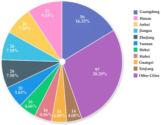 The number and percentage of provincial and municipal distributions of 343 real estate enterprises filing for bankruptcy in 2021 (Figure source: original drawing).