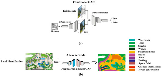 In the concrete design and planning phase, the principle of image generation of the GAN of DL in Figure 4a is widely used in the new application scenario of land use recognition and image rendering of the urban landscape plan [22]. In Figure 4b, GAN can tentatively identify the land use of the urban and design plan, which is similar to the designer’s identification and classification of the functional zoning of the design case plan. GAN can achieve the effect of input conditions to generate rendering drawings with one click after learning the planar texture drawing, which is similar to the drafting process of designers on various types of software. After selecting a specific training set for thorough training, GAN can perform layer analysis and rendering, which previously only designers could do. The automatic detection and rendering of GAN have a great potential to improve the work efficiency of designers and spread it in the planning and design of urban landscapes. In addition, GAN can also be applied to terrain generation.