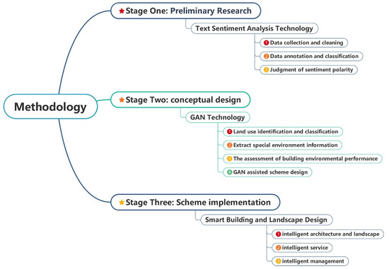 This study focuses on the sustainable reuse of URs using AI technology, which can effectively recycle waste materials and reduce resource waste and greenhouse gas emissions. Firstly, we use sentiment analysis techniques to pre-evaluate the public’s willingness around URs and provide the right direction for the reuse of ruins [49]. Secondly, GAN technology is used in the schematic design phase to identify site information and evaluate building performance and value to achieve sustainable reuse of urban ruins. On this basis, the building and landscape, services, and management will be intelligent, making the reuse of urban ruins more energy-efficient, environmentally friendly, and intelligent [50]. As a result, a whole new set of research methods has been developed, from the emotional analysis of residents to the design of solutions and the intelligent use of urban ruins.