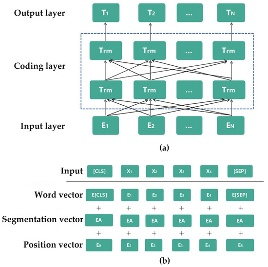 (a) Structure diagram of the BERT model (Figure source: original drawing); (b) Input sequence (Figure source: original drawing).