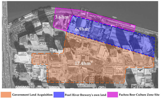 The total land area of the PRB is 27 square hectares. At present, the whole area is divided into three plots, see Figure 7; approximately 17.4 square hectares of the land has been collected and stored by the government in the south. According to the upper-level planning, it will cooperate with the Pazhou CBD to carry out high-density development and construction and gather e-commerce, high-end exhibition and trade, cultural promotion, and other industrial clusters. Approximately 3.6 square hectares north of the Binjiang River has been transformed into the Party Pier Beer Culture and Creative Park, a petite gathering place for exhibitions and cultural leisure in Guangzhou, attracting visitors to target this destination The remaining land is approximately 6.9 square hectares. It is the land reserved by the PRB Group. At present, some of the remains are reserved, including industrial pipelines, coal power plants (coal warehouses and coal conveying corridors, etc.), saccharification and fermentation phases I to IV, sewage treatment plants, packaging workshops, chimneys, water towers, and other original plant facilities and equipment. The former site of Pearl River Brewery is a cultural resource. As an industrial archaeological heritage, it should be further studied and reused for the purpose of sustainability.