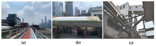 PRB has some problems due to its rapid development. The three parts of the brewery plot are developing rapidly, with too many development models and poor integrity. The land collected and stored by the government on the south side is directly managed and led by the government for development, which is biased towards the social public nature. Due to the nature of the land and the requirements of the development intensity, it has been difficult to retain the site. The overall building construction is a modern architectural style of glass-curtain walls, with mainly office buildings and office spaces. The super-high buildings and population density make the public feel the extremely fast pace of life. The Party Pier Beer Culture and Creative Park focuses on building the architectural style of the online celebrity and petty bourgeoisie, including art spaces, bars, catering, clothing, and other leisure industries. The land reserved by the Pearl River Brewery retains many antiquities of the old site, and the office building of the Pearl River Brewery has been transformed. The overall building gives a nostalgic and retro industrial style. The practice of the three types of models on the land used by the PRB General Factory has led to the unsynchronized development of the plot, the fragmentation of the public space functions, the disunity of the architectural appearance, and the poor integrity to some extent. In addition, Figure 8a demonstrates that the landscape greening is insufficient, as only artificial flowers and grasses were used to decorate instead of natural vegetation and trees, the ecological value of the overall waterfront space was disregarded, and the design presented to the public did not adequately account for the needs of the surrounding area. In Figure 8b in terms of architecture, the PRB’s industrial legacy is now closed and decaying, and the quality of the area needs to be enhanced. In Figure 8c, some of the aisles are too lengthy, and temporary structures have been constructed underneath the process area, which lacks a visible link to the nearby malt barn. There is still a great deal of room for renovation in the future sustainable usage of the PRB. The enhancement of the quality of the plant and the space is a significant challenge and an urgent matter for the self-reserved property, and there is still significant scope for renovation.