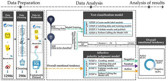 Data collection and cleaning: with the five Chinese network platforms of Ctrip, Mafengwo, Meituan Peripheral Tour, Qunar.com, and Sina Weibo as the data sources, we use python’s BeautifulSoup, URL-lib, re regular expressions, and sqlite3 to achieve crawling, parsing, and storage of the text comment data, we find one of the time nodes, obtain the text comment dataset, and then conduct data cleaning to ensure the quality of later data research. Firstly, we eliminate the advertisement and other types of data that are completely irrelevant to the required data in the comment data set. Secondly, we delete the data published on an official account that cannot represent personal sentiments or tendencies. Following this, we de-duplicate the duplicate data in the dataset to eliminate some empty text data. Finally, we get the data after the cleaning.