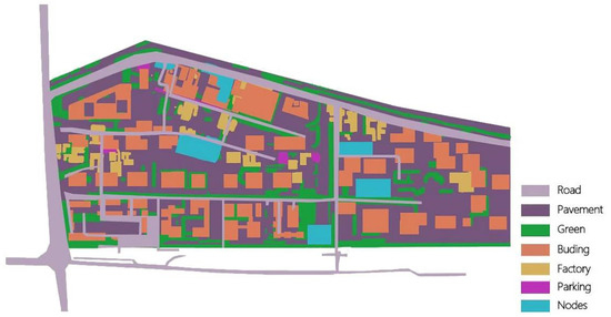 According to different classification objectives and objects, firstly, GAN was used to identify and classify different land texture around Pearl River Brewery, such as roads, pedestrian paths, green areas, buildings, factories, parking lots, and landscape nodes. Figure 10 clearly shows the proportion of each site in the total site after DL identification. The next stage is to extract special environmental information from the site by combining with the remote sensing data, such as the properties of the surrounding water bodies, surface biomass, surface temperature and other climatic properties, to carry out deeper research and thus improve the ecological optimization of the microsite. Subsequently, by combining the generation of the confrontation network Pix2pix with the prediction of environmental performance, an environmental-intelligent evaluation method is formed. In combination with the evaluation criteria of technical value, historical value, and practical value, a full range of model simulations and field research are carried out for the PRB Park, including the overall park construction, functional distribution, structural characteristics of buildings, materials, and forms, to form a comprehensive evaluation system of the environmental material performance. According to this result, the sewage treatment plant and saccharification and fermentation plant that were originally planned to be demolished are industrial relics with a conservation value, and the IC reaction tower, sedimentation tank, and aeration tank of the sewage treatment plant reflect the advanced sewage treatment process. The fermentation tank of the saccharification and fermentation plant is the most important place for the formation of beer flavor, and the core part of the regional production function. At the same time, its structure remains intact, and the internal characteristic space has the potential for transformation and utilization. Finally, the optimization of the reuse of urban ruins increases the likelihood of the retention of the sedimentation tank and aeration tank of the sewage plant, as well as the fermentation tank base of the saccharification and fermentation plant and the surrounding pipelines.