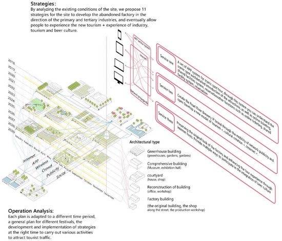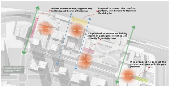 Figure 11 illustrates the transformation strategy process for PRB. In response to the current state of the PRB site, which has too many development modes, public space is fragmented and not integrated, and the building facade is not unified and the integrity is poor, it is necessary to adjust the land use and functional layout in conjunction with the industrial heritage. For the industrial heritage within the scope of government collection, urban design optimization coordinates the demand for heritage preservation and development indicators through the adjustment of the nature of land use and plot division. In the overall land use pattern, the spatial pattern of “dense and sparse” is achieved by increasing the density of municipal public services and efficient and compact land development. Figure 12 uses four landscape axes to connect the four sites (i.e., Smoke Tower Square, Pazhou Square, Jiuquan Square, and Water Tower Square). Smoke Tower Square proposes to unify the architectural style, retaining the chimney and western entrance plaza. Pazhou Square proposes the connection of the riverfront platform, and the transformation of the craft brewery into a restaurant bar. Jiuquan Square proposes the transformation of the packaging workshop inside the building and to retain the Bottom of the fermented portion. Water Tower Plaza proposes the connection of the architectural space with the surrounding park. The full use of the waterfront landscape of the Party Pier District is proposed to guide tourists to separate, gather and disperse, and at the same time strengthen the interrelation of the regional functions in depth, to realize the vitality sharing of regional resources. Based on the overall concept of the site reconstruction planning, and fully considering the current functional structure of the plot, under the premise of protecting the industrial heritage, we will open up a number of waterfront pedestrian corridors, strengthen the connection between the new entertainment and leisure plate along the river and the original industrial renewal plate in depth, and create a dynamic public space while ensuring the high accessibility of the region. “Four axes” means to create a fashion axis with both a modern business atmosphere and an historical sense by vertically combining modern buildings such as the International Beer Headquarter Building and renovated buildings such as the Malt Can Hotel. Relying on many industrial reserved buildings with historical, cultural, and aesthetic values, the dynamic leisure axis full of the flavor of the industrial civilization era is shaped by the transformation of the bottom space and the appropriate functional ratio. In combination with the beer museum, carnival, water tower, and other characteristic buildings, a beer culture axis gathering beer culture is created. In the horizontal direction, the passage between the Smoke Tower and the Malt Can Hotel, and between the Malt Can Hotel and the museum will be opened to form a tourist experience axis connecting various functional areas and connecting ancient and modern cultures.
