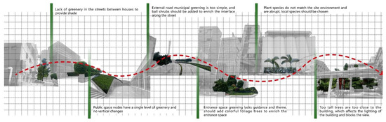 Figure 13 shows that there are many problems in the landscape greening of the whole park, which need to be solved urgently. The greening of the entrance space of the park lacks guidance and theme, and colored-leaf trees should be added to enrich the entrance space. The streets and alleys between houses lack greening to provide shade, and the greening level of the public space is only single-layer, lacking vertical change. The municipal greening of external roads is too simple, and spherical shrubs should be added to enrich the interface along the street. The plant species does not match the site environment, which is very abrupt, so local species should be selected. Plants planted too high are close to residential buildings, affecting the lighting of buildings and blocking the view. To solve the above problems, we need to build a landscape corridor and integrate the characteristic nodes into the public space system for improvement [40,41]. Through the extension of the landscape space, the pedestrian connection between the characteristic nodes and the surrounding land and the riverside is strengthened. Full use of the waterfront landscape of Party Pier District is needed and the surrounding urban landmark buildings could be the visual focus. The path, building volume, and plot landscape could be combined to build a sight corridor. Combining the green space system with the water system, the landscape corridor could be built. Through the public space network, the green space of Pazhou Street West Park in the hinterland could be connected with the riverside landscape belt, so that it can be integrated into the public space system of the area. At the same time, the landscape of the entire park will be transformed, designed and reused, which can also effectively connect several large functional areas, increase connections, and promote the synchronous development of the entire park.