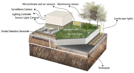 Intelligent air monitoring and regulation and intelligent landscape microclimate regulation mainly involve air quality monitoring, various microclimate monitoring sensors, and foggy forest systems. Air quality monitoring sensors and microclimate monitoring sensors can be set up together using a unified data collector to upload air quality monitoring data. This includes laser dust sensors, sulfur dioxide sensors, nitrogen dioxide sensors, carbon monoxide sensors, ozone sensors, negative oxygen ion sensors, air temperature, and humidity sensors, and light and ultraviolet intensity sensors, etc. The sensor adopts the national standard MODBUS communication protocol, with the built-in international standard 485 communication data acquisition modules to automatically identify various types of sensors. Various and flexible power supply modes can be adopted, such as AC/220V mains power supply, built-in lithium battery pack power supply, or solar battery, and wind–solar complementary power supply, to ensure normal operation in case of power failure in rainy weather. The data acquisition host adopts the remote data wireless transmission mode to build in the data wireless transmission DTU module, and can reserve 485 data output ports to selectively connect the LED information display. Due to the limited scope of outdoor functions, the fog forest system should be installed in the space where people gather and stay, such as near the pavilion structures. The fogging system comprises a high-pressure fogging host, atomizing nozzle, electric control part, network control part, and pipeline. The power of the main fogging machine is 3–5.5 KW, the equipment pressure is 1–20 MPa, the atomizing nozzle is a high-pressure ruby firing pin nozzle, the working pressure is 4–7 Mpa, and the copper pipe or stainless steel pipe has an outer diameter of 7–10 mm and an inner diameter of 5–9 mm. The nozzle aperture is 0.15 mm/0.2 mm/0.3 mm. The intelligent lighting control system is divided into two opening modes, namely, the intelligent perception based on ambient light and the intelligent perception based on the presence of no one. The ambient light intensity relates to the lamp controller through the perception of the light intensity sensor. The working voltage of the light intensity sensor is 9–24 V, and the monitoring light range is 0–200 Klux. It is triggered by a human body’s presence through an infrared detection sensor according to the intelligent perception opening mode of no one passing by. When a person enters the sensor sensing range, the lighting facilities will automatically start, and after a person leaves, the switch will automatically close after a delay. The detection range radius of the human body infrared-detection sensor is greater than 10 m, has a 0–10 V dimming output, a 0–3600 s adjustable delay time, a 180–250 V working voltage, the power consumption of the sensor itself is less than 0.016 W, and the load lamp power is 10–200 W. The sensor facilities required by the intelligent security system include smoke sensors, temperature sensors, high-definition surveillance cameras, and pressure sensors. The pressure sensors need to be installed at the bottom of the equipment to be monitored; therefore, other sensors can be set together with the light poles, and the data can be collected and uploaded through a unified data collector, which can ensure more comprehensive coverage and does not occupy the landscape space. In addition, the security system also needs to be equipped with an audible and visual alarm module to send a signal to remind people to react and avoid danger when an emergency occurs. To sum up, the specific layout of facilities related to intelligent space is shown in Figure 15.