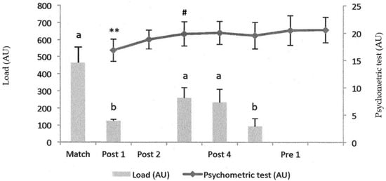 Changes in the results of psychometric tests and the physical load recorded across three microcycles ** difference (p < 0.01) with the other days; # difference (p < 0.05) with Post 2. a Difference (p < 0.01) with the other days. b Difference (p < 0.05) with the other days except with “b”. AU: arbitrary units.
