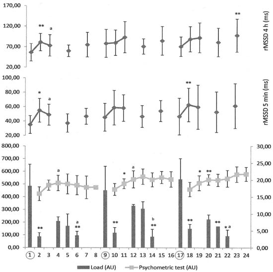 Changes in the load, psychometric test, rMSSD 5 min, and rMSSD 4 h across the three weeks studied. The circles represent the match days. * p < 0.05 or ** p < 0.01 compared to the previous day. a p < 0.05 or b p <0.01 compared to the two previous days; AU: arbitrary units.