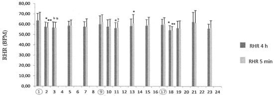 Changes in the RHR during the three weeks of the study. The circles represent the match days. * p < 0.05 or ** p< 0.01 compared to the previous day. a p < 0.05 or b p <0.01 compared to the two previous days; BPM: beats per minute.