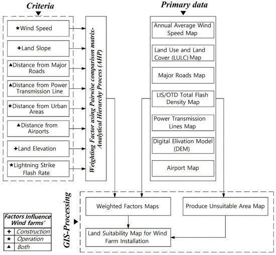 The implementation of wind energy projects necessitates careful consideration of a wide range of variables. Preliminary economic, environmental, and land use requirements must be taken into account when selecting an investment site for a wind power plant (WPP). Additional considerations, such as the impact of WTs on wildlife, shadow flashing, visual impacts, and electromagnetic interference must be taken into account when deciding where to build a wind farm [6]. As a result, the windiest places aren’t always the best; rather, a variety of economic, physical, and ecological factors must be considered in order to select the ideal locations [7]. Wind farm locations are determined utilizing multi-criteria decision-making (MCDM) techniques. Rating method, weighted sum method (WSM), ranking method, Weighted Linear Combination (WLC), analytical hierarchy process (AHP), Boolean overlay operation, analytic network process (ANP), trade-off analysis method, concordance analysis, Order Weighted Average (OWA), and Elimination Et Choice Translating Reality (ELECT) are MCDM techniques that can be combined with the Geographic Information Systems (GIS) environment [8]. The WSM is commonly utilized to find solutions to decision-making issues that only involve a single dimension; however, its application in scenarios involving multiple dimensions is notoriously difficult [9]. In addition to this, the ELECTRE method is ideal for use in settings where there are a variety of factors to consider and a considerable number of alternatives to choose from. Despite this, it is not a foolproof method for picking the best available alternative [10]. On the other hand, the AHP is regarded as the most popular MCDM technique in the literature for analyzing renewable energy sites because it is simple, straightforward, and can examine the consistency of the decision. It has the advantage of simplifying decision-making challenges that require a high level of consistency and flexibility. The framework can also combine quantitative and qualitative criteria. AHP is a mathematical method that assigns a relative weight to each criterion based on the decision-makers’ expert opinions when comparing paired criteria [11,12].