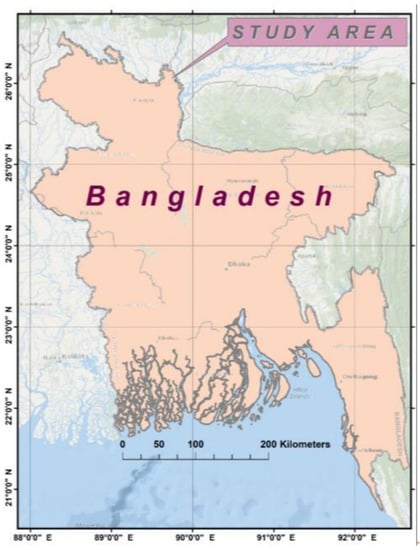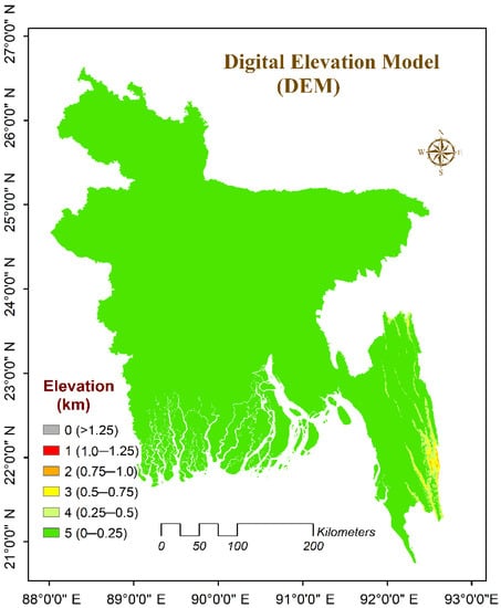 The geographical extent of the study region, Bangladesh, can be found in South Asia between the coordinates 20°34′ N and 88°01′ E and 26°38′ N and 92°41′ E. Bangladesh is encircled on three sides by the country of India (i.e., west, north, and northeast). It shares a border with Myanmar on the southeast, while the southern side encompasses the Bay of Bengal and has a coastline that is more dispersed (Figure 2).