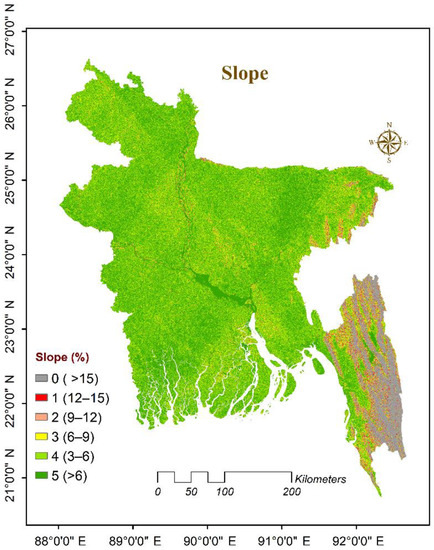 Amongst the geographical features the most crucial is the land slope that evaluates the feasibility of the wind farms’ site from the point of construction costs. The installation of the wind farm on the steep slopes results in a higher construction cost. In addition, the land slope is taken into consideration to be significant due to the fact that it has the potential to hasten the wind speed due to the Venturi effect. Figure 4 is a slope map that demonstrates how nearly all of the land in Bangladesh, which accounts for 46.44 percent of the country’s total land area, is extremely well suited for the establishment of wind farms.