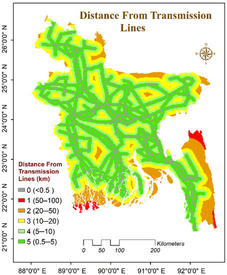 For the most part, the wind farm’s primary goal is to produce electricity and then feed it into the local grid via transmission lines. Therefore, the distance between potential wind farm locations and existing transmission lines and the power system is a critical consideration when selecting a wind farm site. To minimize the negative effects of power transmission on public health, a bare minimum distance should be determined [14]. According to this study, the minimum distance between power transmission lines and the power grid is 0.5 km [17].