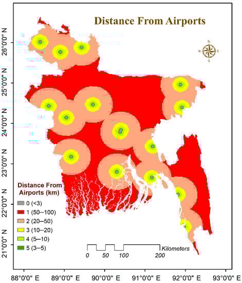 The aviation infrastructure has a significant impact on both wind farm construction and operation. The aircraft’s operations during takeoff and landing have a negative impact on the wind farms. From a variety of perspectives, researchers examine the distance from airports. Some argue that wind farms can be built and maintained more easily and cost-effectively if they are located far from airports. Some researchers, on the other hand, believe that wind farms will impede air traffic control and air cargo security by creating permanent barriers in navigation, communication, and transmission systems. However, the map of the distance from the airport has been presented in Figure 7.