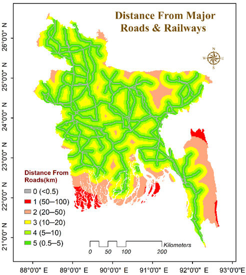 The distance of the wind farm from the major roads and railways has a significant impact on the building and operation of wind farms. If the wind turbines are positioned too near busy highways and railway tracks, an unanticipated accident may occur. However, if they are placed a great distance away, the initial investment would be higher. Here, the map of connectivity to roads and railroads is shown in Figure 8. This map reveals that 29.42% of the land area is located 0.5–5 km away from roads and trains, making it a potential location for wind farms. In addition, approximately 25.40% of the land area is situated 5–20 km away from roads and trains, making it suitable for investments in wind energy. In contrast, 24.15% of the land area is regarded as less favorable or unsuitable for the establishment of wind farms.
