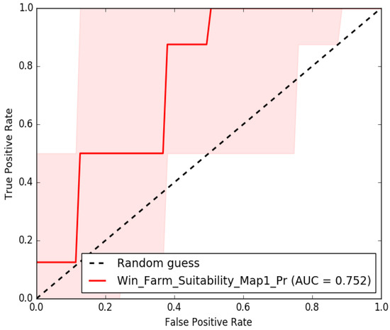 The SREDA is currently engaged in ten wind farm projects in Bangladesh, the locations of which are depicted in Table 8. However, in order to assess the viability of the current study, the locations of these projects have been superimposed on the suitability map, which is the result of this study. It was discovered that two projects whose construction is already complete and in operation are located in very high and high suitability areas, while two projects that are still under construction are located in moderate and high suitability areas. One of the remaining six projects for which feasibility studies have been completed and for which construction will soon commence is located in a very high suitability area, while another is located in a high suitability area, and the remaining four projects are located in areas with moderate suitability. In addition to this qualitative performance evaluation technique, the ROC and AUC tools were employed to quantify the statistical validity of this study. As the AUC value is determined to be 0.75 in Figure 12, it is determined that the performance of this study in selecting suitable sites for wind farms is satisfactory (Table 5).